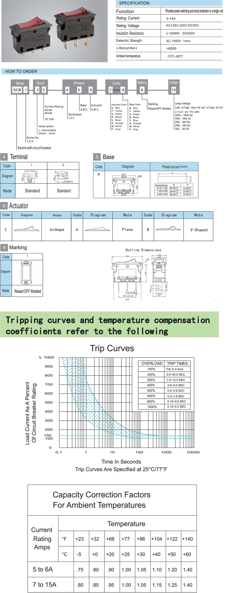 Our SCB Circuit Breaker boasts a dielectric strength of AC 1500V for 1 minute, ensuring reliable performance under demanding conditions. With a rated current range of 5-15A and a rated voltage of AC 125V/220V and DC50V, it is suitable for a wide range of applications. The mechanical life of 6000 cycles guarantees long-lasting durability.